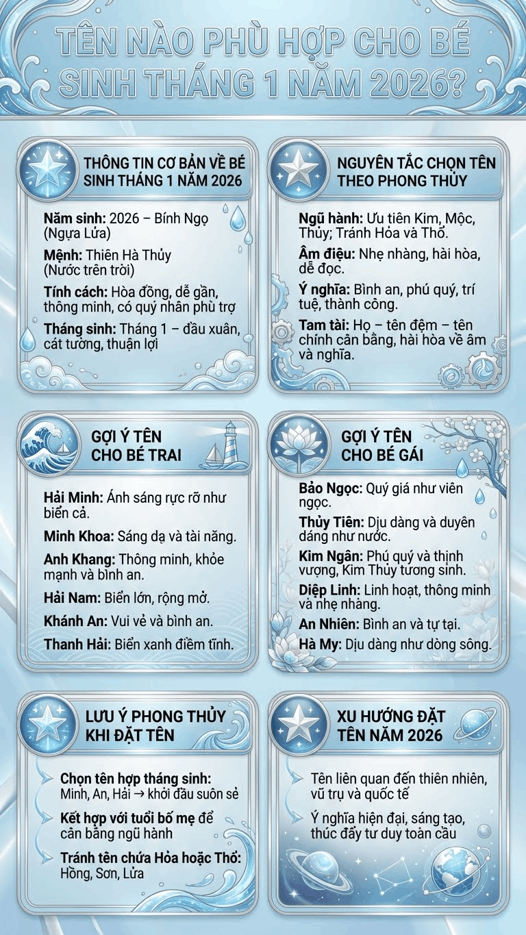 Việc đặt tên con sinh tháng 1 năm 2026 luôn được nhiều bậc cha mẹ quan tâm bởi cái tên không chỉ để gọi mà còn gắn liền với vận mệnh và tương lai của trẻ. Bé sinh đầu năm Bính Ngọ 2026 thuộc mệnh Thiên Hà Thủy, vì vậy khi đặt tên cho con sinh tháng 1 năm 2026 nên ưu tiên những tên mang yếu tố Kim, Mộc hoặc Thủy để tăng sự tương sinh và mang lại may mắn. Một cái tên hay cho bé sinh tháng 1 năm 2026 vừa đẹp về ý nghĩa, vừa hợp phong thủy sẽ giúp con có khởi đầu thuận lợi, cuộc sống bình an và dễ đạt thành công trong tương lai.